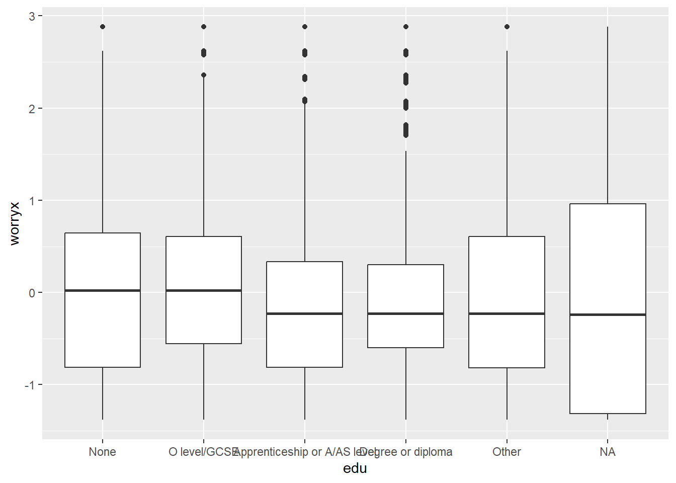 # EXAMPLE: boxplot of worryx by edu.